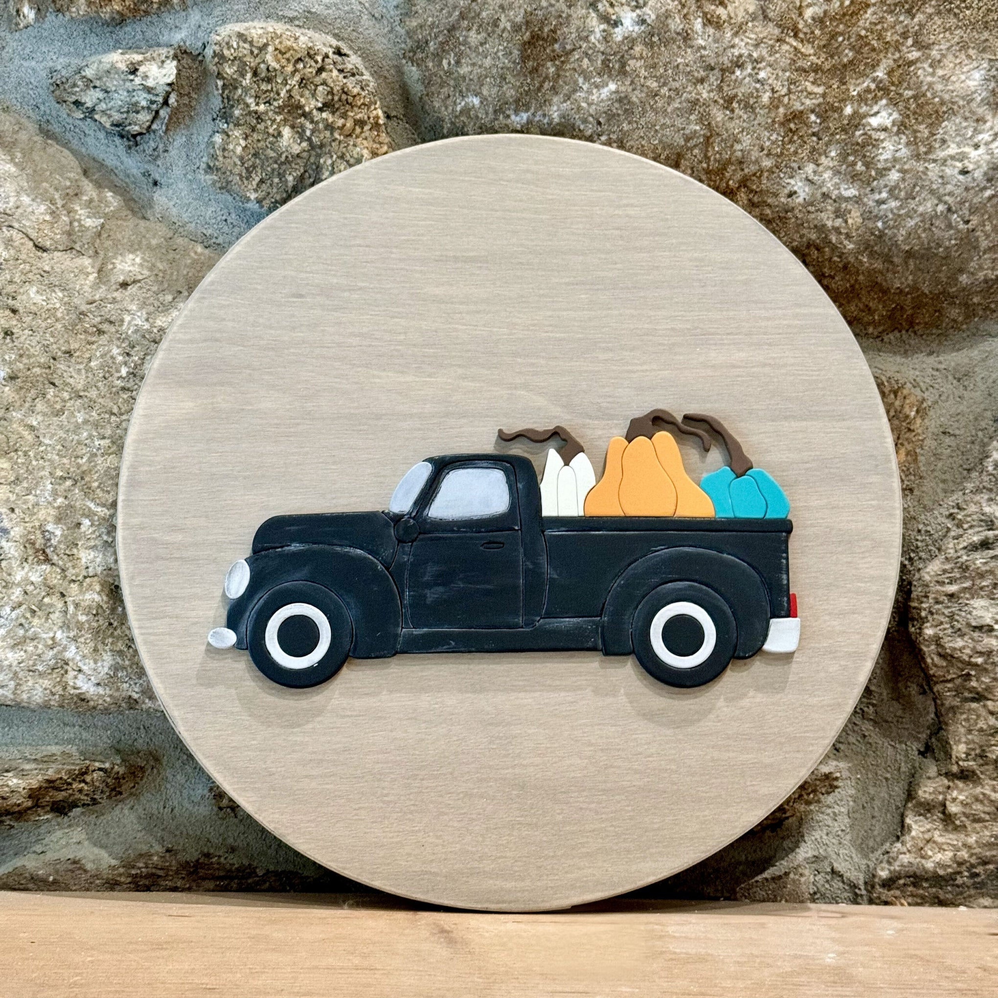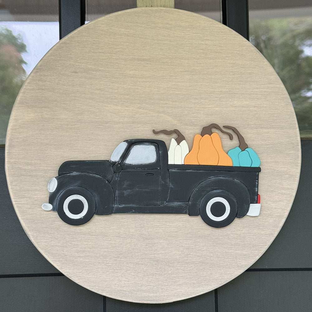 Handcrafted Fall Truck Wood Sign with Pumpkins - 12 Inch Round Rustic Decor