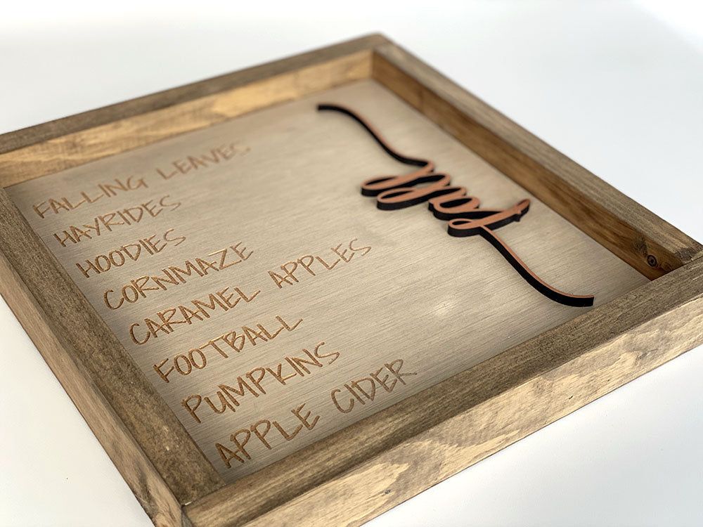 This handcrafted fall word collage brings warmth and seasonal beauty to your home. Each piece showcases expert craftsmanship with rich Briarwood staining and an elegant Oxford Brown frame that complements any interior style.