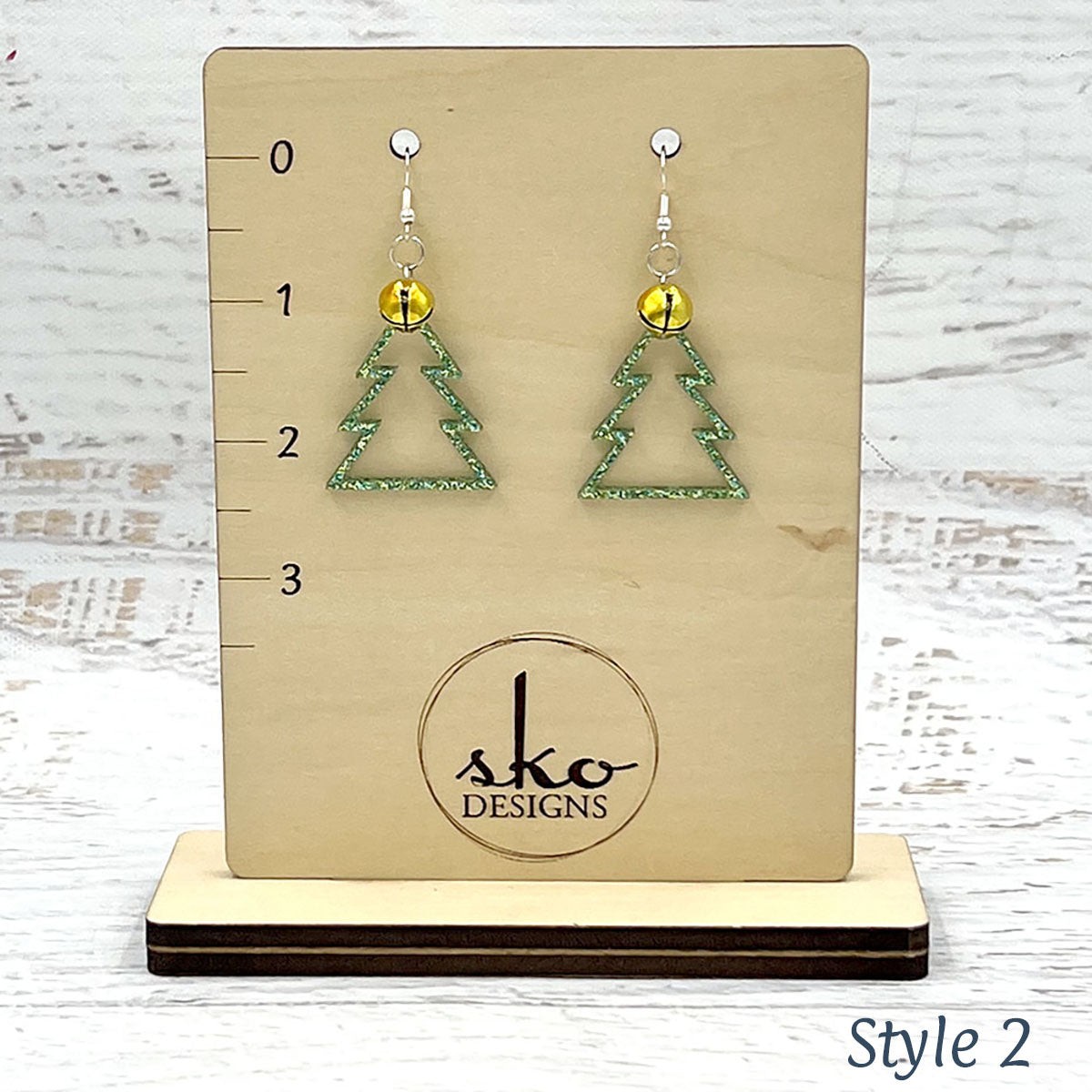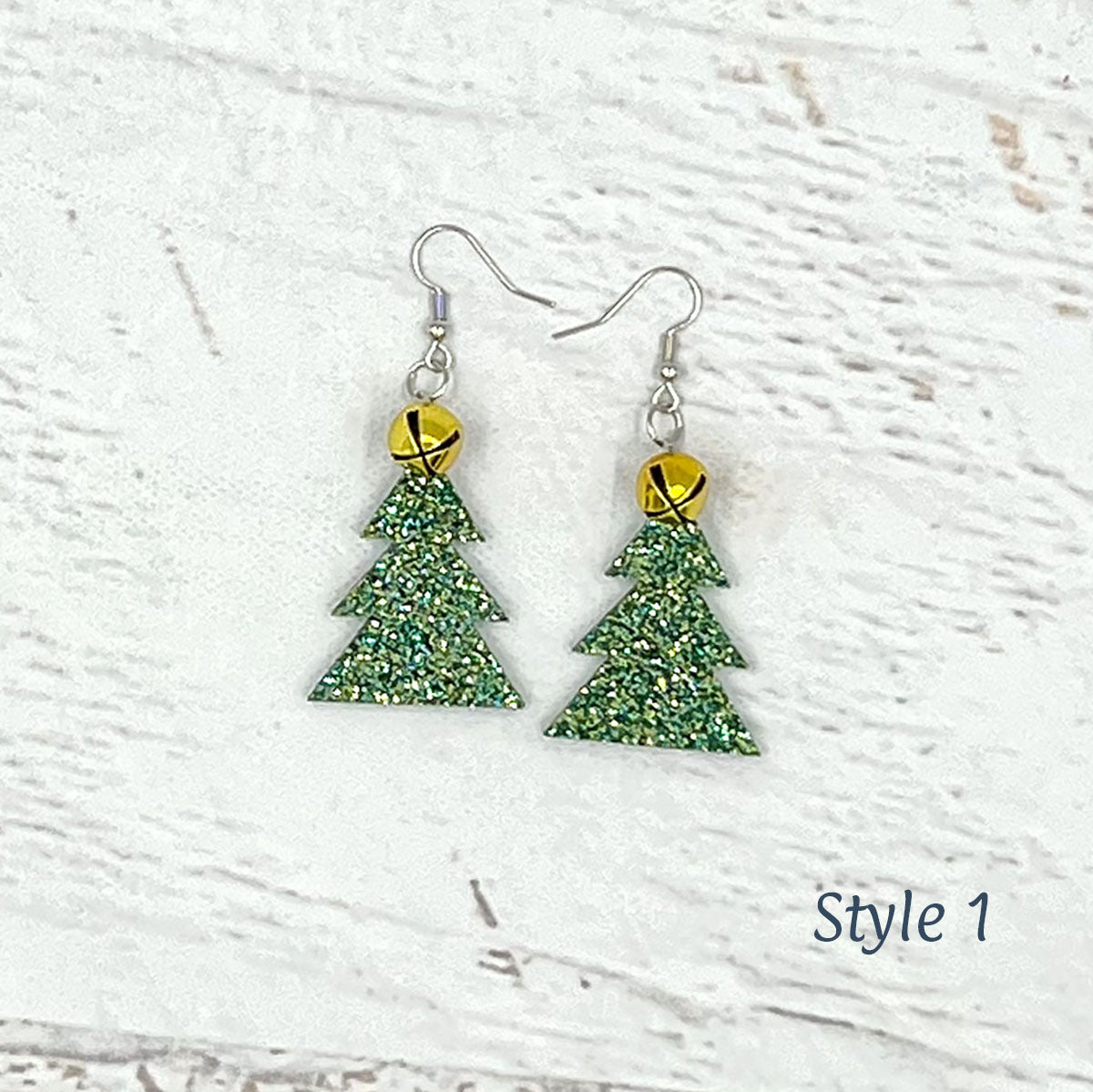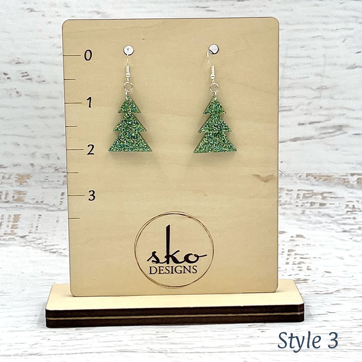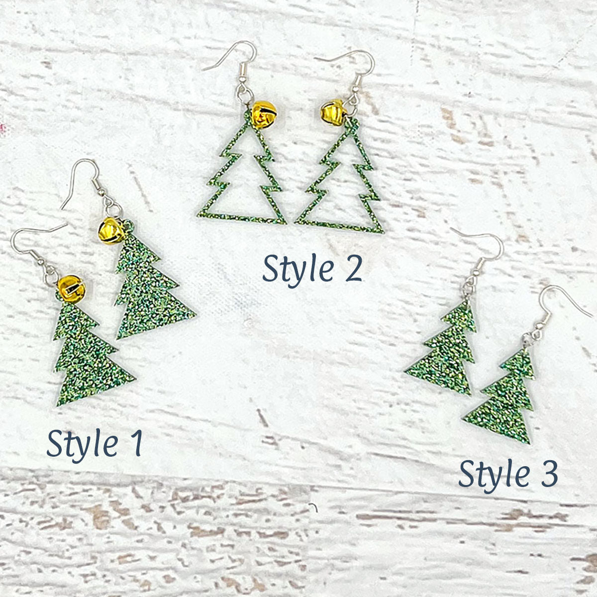 Add festive charm to your holiday wardrobe with these stunning tree earrings. Each pair features beautiful green glitter acrylic that catches the light with multiple shades of green and hints of gold shimmer.